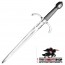 Thanks to its size, it can be used as a secondary offensive weapon and not for parrying only. Two fullers, each with holes in four places, run the entire length of the ricasso. This ornamental device makes the Munich Town Watch dagger exciting and a bit lighter at the same time. The grip is very ergonomic. It is made of wood elaborately wrapped with steel wire and has decorative braided wire at both ends. A riveted pommel shaped like a flattened ball completes the hilt of our Munich Town Watch dagger. It comes with a matching scabbard made of leather.
